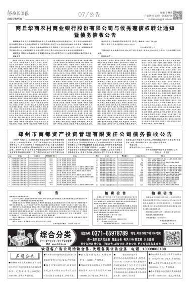 根据商丘华商农村商业银行股份有限公司与侯秀莲达成的债权转让协议,商丘华商农村商业银行股份有限公司将如下清单中所列借款合同及担保合同项下的全部权利依法转让给侯秀莲。现特此公告通知各借款人及担保人。现请如下清单中所列借款人及担保人,自2025年10月12日起,依照借款合同及担保合同约定向侯秀莲履行主债权合同及担保合同约定的还本付息义务或相应的担保责任。 特别声明:借款人的具体身份信息及借款明细本公告中不再予以公式,以借款票据和核实的信息为准。 特此公告 商丘华商农村商业银行股份有限公司 联系人:廉存光15803700168 受让人联系方式为:侯秀莲13903700128 2025年10月12日 下列债务人未如期履行还款义务,现予以公告催收,请债务人自公告之日起15日内自觉履行还款义务。 附名单如下: 张怀敬、张永军、沈长国、吴丰收、尹善正、祁让生、吕玉红、祁让生、吕满奎、郭来志、李藏义、吕金龙、郭来生、吕玉州、吕玉州担保人吕玉红、郭来志、吕玉州、祁让生、刘敏刚、郭来全、吕玉红、郭云房、吴俊魁、郭来志、吕金龙、刘会军、吴俊魁、李建华、郭来新、郭云力、吕金龙、郭恒报、王启玉、刘会田、熊修魁、高胜、候良动、吕玉江、刘会军、郭恒立、张中民、郭庆付、郭恒林、张安良、袁保燕、刘会保、白卫东、王启玉、候良动、袁红成、郭德亮、郭云青、郭来付、朱新装、李秋云、白青华、翟玉停、袁红成、郭记生、霍亚彬、霍亚彬、白桂林、韩学书、马凤英、霍亚彬、张中民、周富强、刘敏恂、王广书、白清华、朱铁庄、刘会超、郭云青、候良动、刘会海、孟凡芝、刘平建、田燕燕、李修建、刘杰、刘洪昌、王礼乾、王现力、王学停、王停利、肖冬华、王晓林担保人王习山、王伯勤担保人王守亮、王坤朋担保人王守亮、王伟丽担保人王守亮、刘会军、刘安运担保人刘敏运、刘东洋、邓凤玲、王启玉、史有海、薛信生、陶中亮、史有海、史运红、邱向真、陈钦修、陶红丽担保人刘敏动、郭秀娟担保人郭明亮、李景荣担保人郭明亮、郭利娟担保人郭明亮、郭素娟担保人郭明亮、施杰、苑敏担保人施杰、苑英担保人施杰、郭明亮、刘文帅、李庆华、刘如意、白西安、白西安、洪秀云、刘会中、马喜良、崔玉萍担保人刘敏运、白桂林、吕玉周、袁红、李永、刘会海、杨跟强、王德林、郭发永、郭云东、刘丰收、李景峰、沈长建、李齐身、史有红、李红丽、史友海、史运红、刘敏运、李凤芝、代新建、郝正思、余校江、翟玉停、张玉锦、杨义钦、杨云、安卫峰、陈宗志、刘尊超、谢中利、张安利、张安红担保人张安利、张安宏担保人张安利、运红、刘会彬、刘德显、李勇、高代兵、李勇、高胜、郝正思、张红军、刘利华、贾彬、武广玉、李修杰、郭云芝、刘会明、霍献伟、刘尊强担保人马继东、马继东、候秀丽、马传连担保人马继东、谢行义、邓秀云担保人马继东、陶存厚、刘亚州担保人霍献伟、孙志强、刘得显担保人霍献伟、陈诗林、陈诗星、杨圣春、杨庆志担保人杨圣春、杨同州担保人杨圣春、杨庆亮担保人杨圣春、霍松梅、陈诗江、杨春芝、李太仁、李照波、王勤清、谢中身、谢团结、马书全、李照波、张安利、李照波、张站良、刘晶晶、陈宗志、岳思清、王立志、杨万里、葛红伟、胡宵燕、李全景、刘明国、高代祥、杨新义、陈超志、李开福、张安利、张安利、马付全、曹厚振、刘振宇、陶中奎、张桂英、刘振宇、张桂英、陶存栋、陶存涛、马传化、闫德峰、王德昌担保人郭冬梅、陶中奎、曹后震、谢卫民、谢世伟担保人郭冬梅、杨同领、郭冬梅、陈诗林、候艳玲、刘敏运、陶存厚、陈宗志、马继东、马继东、闫志亮、张安红、崔玉霞、谢团结、高洪德、陶存涛、谢时海、高照兰、高照林、岳孝中、杨庆云、陈华、郭运成、石长传、廉爱勤、李景兰、高代峰、曹彦显、吴涛修、韩言福、谢中兴、吴铁柱、张东亮、刘文林、李俊领、李俊领、李新胜、刘书光、黄雪明担保人曹福军、刘克堂、吕玉昌、王世挠、孙志亮、房桂生、刘齐栋、候公明、候正亮、邓缓修、孙宽臣、霍亚彬、吴险峰、房立臣、刘文华、王记书、房立臣、周玉峰、刘文俊、高才军、杨万里、谢时现、李格付、贾彬、李良武、李景法、张明亮、张永胜、吕玉昌、王启峰、贾其超、刘伟、刘伟、豆爱萍、徐道善、徐道善、徐道善、徐道善、徐道善、徐道善、贾其超、张素强、张玉锦、沈义新、王守云、吴言峰、张贤春、孙付松、王启彬、刘德池、刘成友、刘成友、杨文跟、刘尊玉、李云红、郭来中担保人郭志宏、郭志宏、吕金星担保人郭志宏、胡生峰担保人郭志宏、王进亮担保人谢世金、谢世金、郭云见、郭云兰、王新胜担保人郭云见、李素霞、霍卫国、崔红亮、郭亮担保人谢世金、韩世军担保人郭恒东、郭恒新担保人郭恒东、郭恒东、霍亚彬、吴春华、刘胜利、贾彬、武广玉、王建峰、陈鹏、刘东洋、康燕、张玉锦担保人田凤、田凤、李景兰、李明、李景兰、房贵友、张玉锦担保人田凤、候贤军、李景兰、房贵友、房贵友、李景兰、戚世昌、吕玉昌、 刘红雅、刘化厂、郭恒杰、谢世金、房贵友、刘海军、刘胜利担保人刘海军、谢世全、郭振清、马爱芝担保人刘松峰