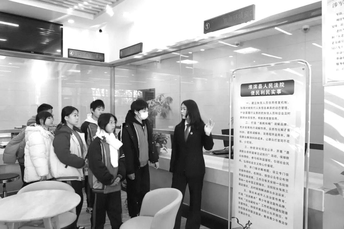 12月19日,淮滨县法院联合县妇联开展“法治阳光,温暖守望”关爱留守儿童专题开放日活动。淮滨县育才学校的师生代表走进法院,了解法院便民服务,通过模拟庭审感受法律的神圣与威严。
