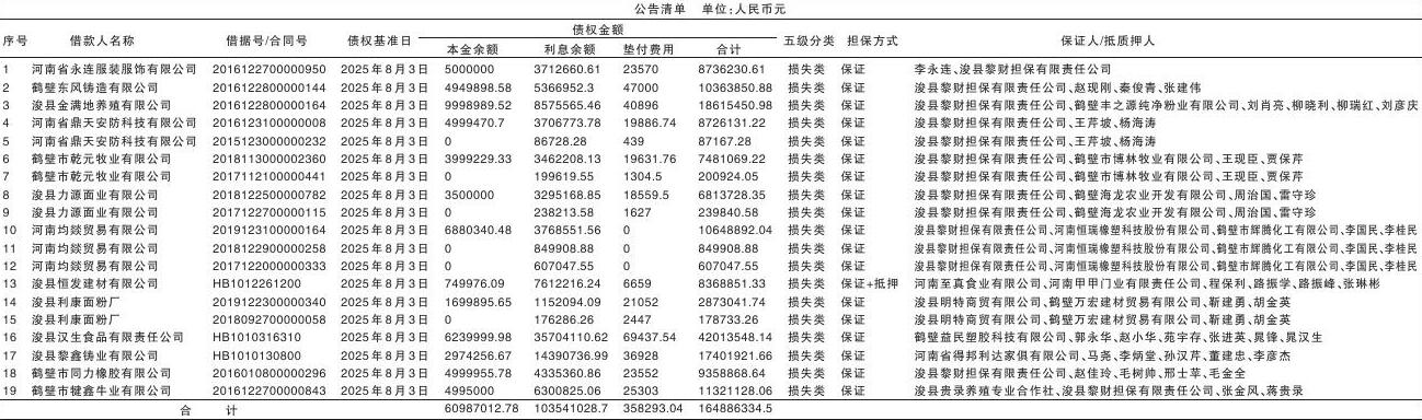 根据中原银行股份有限公司鹤壁分行(下称中原银行鹤壁分行)与河南资产管理有限公司达成的《资产转让合同》,中原银行鹤壁分行将其对下列公告清单所列借款人及其担保人享有的主债权及担保合同项下的全部债权(包括但不限于抵债协议、还款协议和其他相关协议以及担保债权、违约金债权、损失赔偿权、利息债权、转让方已经缴纳的诉讼费、保全费等项下的全部权利)依法转让给了河南资产管理有限公司。中原银行鹤壁分行与河南资产管理有限公司特公告通知各借款人、担保人以及其他相关各方,自公告发出之日起立即向河南资产管理有限公司履行还本付息义务或承担相应的担保责任。 河南资产管理有限公司作为下列债权的受让方,现公告要求公告清单所列借款人及其担保人(含相关承债主体、清算主体),自公告发出之日起立即向河南资产管理有限公司履行主债权合同及担保合同约定的还本付息义务或承担相应的担保责任。 特此公告 中原银行股份有限公司鹤壁分行 河南资产管理有限公司 2026年1月12日 中原银行鹤壁分行联系方式: 地址:鹤壁市淇滨区淇水大道与朝歌路交叉口东北角金融大厦 联系人:王先生 电话:13333923000 河南资产联系方式: 地址:郑州市郑东新区龙湖金融岛中环路21号11楼河南资产大厦 联系人:刘先生 电话:15890126661 注:1.本公告清单列示各债权基准日的贷款本金、利息余额。借款人和担保人(含相关承债主体、清算主体)应支付给河南资产管理有限公司的债务金额按借款合同、担保合同、还款协议和其他相关协议及中国人民银行的有关规定或生效法律文书确定的方法计算;已经进入诉讼程序并已由河南资产垫付的应由借款人及/或担保人、承债主体、清算主体负担的诉讼费、律师费等以有关法律文书确定的金额为准。 2.若借款人、担保人因各种原因更名、改制、歇业、吊销营业执照或丧失民事主体资格的,请相关承债主体及/或主管部门代为履行义务或履行清算责任。 3.下列主债务人、担保人如有疑问,请与中原银行鹤壁分行或河南资产管理有限公司联系。 4.本公告如有漏登、错登,以实际债权凭证为准。 |