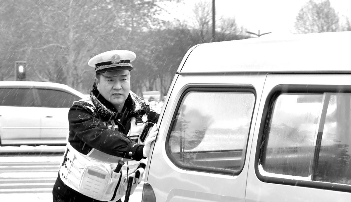 1月19日,洛阳市普降大雪。洛阳交警以雪为令,坚守一线,随时应对各类突发交通状况,为群众出行安全保驾护航。图为交警帮助司机把打滑车辆移至安全地带。