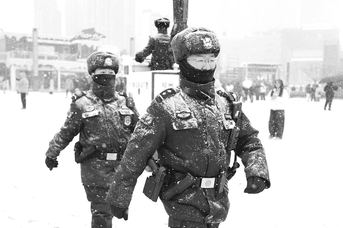 1月19日,我省迎来降雪天气,郑州市二七广场银装素裹,一抹“藏青蓝”在风雪中格外醒目。他们是守护群众平安的郑州市公安局特警支队二大队巡逻民警。