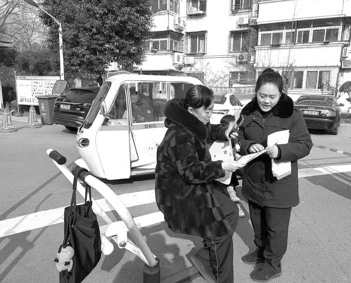 为保障居民生命财产安全,近日,永城市消防救援部门工作人员走进辖区老旧小区开展消防宣传,进一步增强群众消防安全意识及自防自救能力,有效预防和减少居民小区火灾事故发生。图为1月18日,工作人员向居民发放消防安全知识彩页。