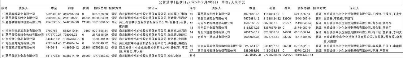 根据中国建设银行股份有限公司河南省分行与河南资产管理有限公司签署的编号为CCB20250008-HA2的《资产转让合同》,中国建设银行股份有限公司河南省分行已将其对下列债务人及其担保人享有的主债权及担保合同项下的全部权利,依法转让给河南资产管理有限公司。中国建设银行股份有限公司河南省分行与河南资产管理有限公司联合公告通知各债务人、担保人以及其他相关义务人。 河南资产管理有限公司作为上述债权的受让方,现公告要求公告清单中所列包括但不限于借款人、担保人、其他相关义务人及其承债主体、清算主体等,从公告发布之日起立即向河南资产管理有限公司履行主债权合同、担保合同及其他相关合同约定的偿付义务或相应的担保责任及其他责任等。 特此公告 河南资产管理有限公司 联系人:杨先生 联系电话:18817623898联系地址:河南自贸试验区郑州片区(郑东)金融岛中环路21号 中国建设银行股份有限公司河南省分行 联系人:薛先生 联系电话:17837128716 联系地址:河南省郑州市花园路80号中国建设银行股份有限公司河南省分行 中国建设银行股份有限公司河南省分行 河南资产管理有限公司 2026年1月20日 注:1.本公告清单列示截至基准日的债权本金余额、利息余额、费用,基准日后债务人和担保人应支付的利息、违约金、相关费用等按照相关合同协议、生效法律文书及法律法规的规定计算。 2.若债务人、担保人及其他相关义务人因各种原因更名、改制、歇业、吊销营业执照或丧失民事主体资格的,请相关承债主体及/或主管部门代为履行义务或履行清算责任。 3.清单中的“担保人及其他义务人”包括但不限于抵押人、出质人、保证人、差补义务人等。 4.本公告清单列示的金额由于计算方法等原因与实际金额可能存在较大误差,具体以相关合同协议及有效法律文书计算为准。 5.本公告如有漏登、错登,以实际债权凭证为准 |