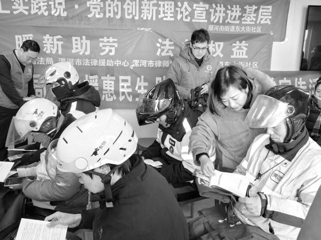 日前,漯河市司法局、市法律援助中心联合市律师协会、漯河市源汇区顺河街街道办事处,在东大街社区红色驿站举办了一场“送法进驿站”普法宣传活动,为外卖骑手、快递员等送上干货满满的“法治礼包”。