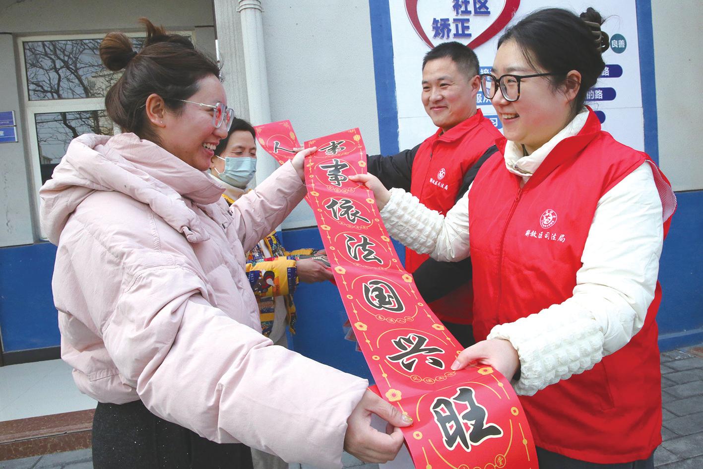 新春将至,焦作市解放区司法局印制1万副法治春联赠送给群众,并通过在春节前期启动“入户送法典”“干部齐学法”“普法进企业”等系列主题活动,实实在在为群众送上零距离、接地气、有年味的普法“大礼包”。李亮贵摄