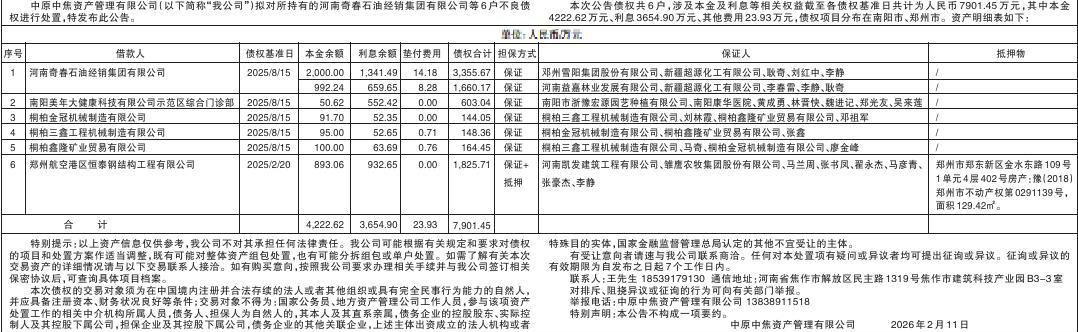 中原中焦资产管理有限公司关于对河南奇春石油经销集团有限公司等6户不良债权的处置公告