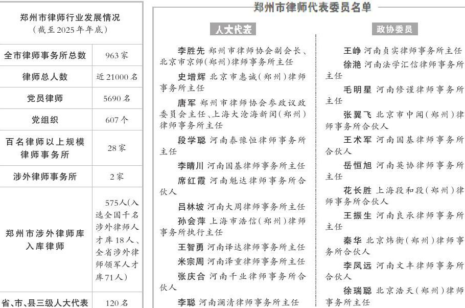 人勤春早,万象更新。伴随着“十五五”规划开局的奋进号角,2月6日至9日,2026年郑州市两会召开。来自全市律师行业的12名人大代表、11名政协委员肩负党和人民的重托步入会场,为发展大局建言,为基层善治献策,为民生福祉聚力,成为两会会场里一道亮眼的法治风景线。 “律师代表委员兼具律师的专业视角和代表委员的履职责任,是促进司法公正、推动法治进步的重要力量。”郑州市律师协会会长赵虎林说,“当前,郑州正加快建设国家中心城市,法治是城市核心竞争力的重要支撑,是高质量发展的坚实保障。全市律师行业深耕法治建设一线,已成为法治郑州、平安郑州建设的重要生力军。” 郑州市司法局党委、市律师行业党委高度重视律师参政议政工作,要求律师坚守法治初心、发挥专业优势,把法律服务做到群众心坎上,把履职建言落到发展关键处。 赵虎林表示,全市律师将坚持政治引领、践行执业为民,在服务中心大局、维护公平正义、保障民生福祉中展现新作为,为郑州国家中心城市建设贡献更大法治力量。 1建睿智之言:以法治之谋服务发展大局 发展是第一要务,法治是最优保障。律师代表委员立足专业优势、实践优势和职业优势,聚焦中心工作,把法律专业素养转化为服务发展大局的精准建言,让法治成为郑州高质量发展的鲜明底色。政协委员王振生关注郑州“1+7”法务区建设,提出关于强化市级财政保障加快推进郑州“1+7”法务区建设的提案,为郑州国家中心城市建设提供优质高效的法律服务。 优化法治化营商环境是律师代表委员关注的核心议题。人大代表史增辉提出,全面推行“三书同达”制度,在对企业进行行政处罚时同步送达决定书、合规建议书与信用修复告知书,帮扶企业整改修复;严格落实“无事不扰”制度,深化“双随机、一公开”监管,按信用风险分级分类检查,精简现场检查,推广非现场监管模式;建立执法争议快速协调专窗,高效化解跨部门执法争议;建立企业承诺制度,行业商会引导企业自律承诺,行政机关对守信企业减少检查频次,对失信违规行为则从严处罚。 服务产业高质量发展,律师代表委员精准发力、靶向建言。他们聚焦先进制造业、人工智能、低空经济、文旅文创等重点产业,结合地方立法需求提出完善法治保障的具体方案。围绕国资国企改革,多名代表委员呼吁全面推进企业合规管理体系建设,构建省、市、县三级合规格局,以合规赋能国有企业高质量发展。 助力改革攻坚,律师代表委员主动担当、积极作为。他们围绕企业破产重整、风险化解,建议配齐配强破产审判力量,完善破产管理人制度,创新资产处置方式,助力困境企业重生;围绕乡村全面振兴,提出加强农村法治建设、规范土地流转、保障农民权益,以法治护航农业强、农村美、农民富。 本次两会,律师代表委员共提交议案提案125件,其中人大代表提交议案87件,政协委员共提交提案38件。内容覆盖经济发展、法治建设、社会治理、民生保障、律师执业权益保障等各领域。一份份议案提案,字字紧扣发展,句句彰显担当,为郑州国家中心城市现代化建设注入强劲法治动力。 2献务实之策:以法治之力推进基层善治 基层治则天下安。法治是基层治理的最优路径,也是提升治理效能的关键支撑。律师代表委员深耕基层一线,倾听群众呼声,洞察治理堵点,将法治思维和法治方式融入基层治理全过程,推动矛盾纠纷化解在基层、解决在萌芽状态,以务实举措助力基层高效能治理。 聚焦矛盾纠纷多元化解,律师代表委员精准建言破题。人大代表孙会萍提出加强二审审判质量、杜绝程序空转,推动司法机关强化释法说理、注重实质化解纠纷,努力实现案结事了人和。 关注基层治理精细化,律师代表委员聚焦民生关切补短板。针对小区物业纠纷、业委会运行不规范等群众家门口的烦心事,政协委员王峥建议建立物业退出预警机制,规范业委会全过程监督,妥善化解物业纠纷。围绕数字治理乱象,有代表委员提出制定监管标准、强化跨部门协同治理,守护个人信息安全。针对基层合法性审查薄弱的问题,有代表委员建议构建市、县、乡、村四级审查体系,提升基层决策法治化水平,从源头防范治理风险。 守护重点群体权益,律师代表委员用心用情显担当。人大代表段学聪围绕未成年人心理健康、残疾人就业康复等问题建言献策,完善政策法治保障,让特殊群体共享发展成果。 从社区治理到矛盾化解,从民生小事到治理大局,律师代表委员以专业视角找准痛点、难点、堵点,用务实之策打通服务群众的“最后一公里”。 3 聚协作之力:以法治之心守护民生福祉 民生无小事,枝叶总关情。律师代表委员始终坚持以人民为中心的发展思想,把群众的急难愁盼放在心上,积极建言献策、参与立法协商、开展民主监督,解决群众关心的就业、教育、医疗、养老、食品安全等问题,守护民生温度。 聚焦民生热点,精准发声解民忧。围绕就业保障,有代表委员建议将法治教育纳入高校毕业指导,开展规范招聘市场秩序专项整治,强化平台责任,筑牢就业法治防线。针对城市停车难、交通拥堵问题,有代表委员建议推进立体停车场建设,加快停车管理立法,破解城市交通难题。 守护民生底线,筑牢法治保障网。 聚焦食品安全问题,有代表委员建议出台行业标准,强化准入监管,推行“互联网+明厨亮灶”、