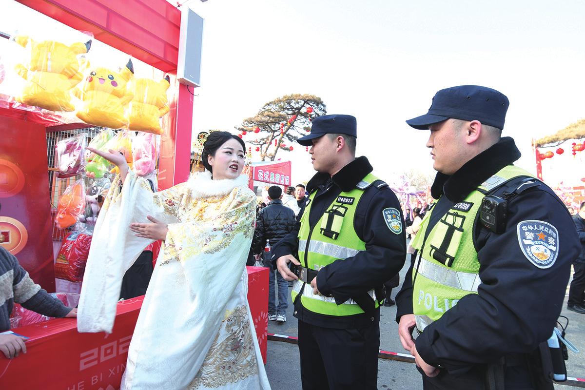 2月17日,大年初一,浚县公安局民警、辅警在浚县古城景区和大伾山风景区分片定点执勤巡逻,依法处置各类警情,并为游客提供各种引导、救助服务。