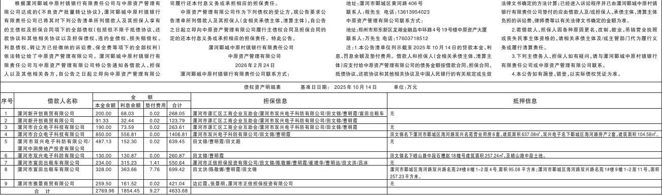 漯河郾城中原村镇银行有限责任公司与中原资产管理有限公司 债权转让暨债务催收联合公告