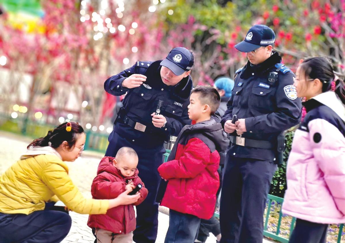 春节假期期间,郑州市公安局金水分局民警辅警坚守一线、履职尽责,用坚守诠释担当,以服务温暖民心,全力守护辖区群众度过平安祥和的新春佳节。图为2月23日,金水分局花园路派出所民警在重点路段加强巡逻,及时排查化解各类安全隐患。