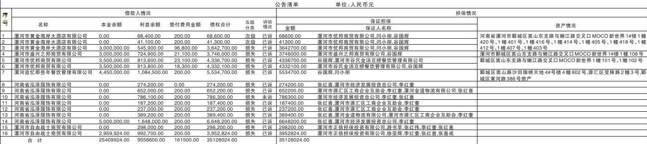 根据漯河郾城中原村镇银行有限责任公司与河南资产管理有限公司签署的编号为YCZYPZ202603001的《不良资产批量转让协议/合同》,漯河郾城中原村镇银行有限责任公司已将其对下列债务人及其担保人享有的主债权及担保合同项下的全部权利,依法转让给河南资产管理有限公司。漯河郾城中原村镇银行有限责任公司与河南资产管理有限公司联合公告通知各债务人、担保人以及其他相关义务人。 河南资产管理有限公司作为上述债权的受让方,现公告要求公告清单中所列包括但不限于借款人、担保人、其他相关义务人及其承债主体、清算主体等,从公告之日起立即向河南资产管理有限公司履行主债权合同、担保合同及其他相关合同约定的偿付义务或相应的担保责任及其他责任等。 特此公告。 河南资产管理有限公司 联系人:刘磊 联系电话:0371-56826623联系地址:河南自贸试验区郑州片区(郑东)金融岛中环路21号 漯河郾城中原村镇银行有限责任公司 联系人:张永阵 联系电话:18639509292 联系地址:漯河市郾城区黄河路406号 漯河郾城中原村镇银行有限责任公司 河南资产管理有限公司 2026年4月1日 注:1.本公告清单列示截至基准日的债权本金余额、利息余额、费用,基准日后债务人和担保人应支付的利息、违约金、相关费用等按照相关合同协议、生效法律文书及法律法规的规定计算。 2.若债务人、担保人及其他相关义务人因各种原因更名、改制、歇业、吊销营业执照或丧失民事主体资格的,请相关承债主体或主管部门代为履行义务或履行清算责任。 3.清单中的“担保人及其他义务人”包括但不限于抵押人、出质人、保证人、差补义务人等。 4.本公告清单列示的金额由于计算方法等原因与实际金额可能存在较大误差,具体以相关合同协议及有效法律文书计算为准。 5.本公告如有漏登、错登,以实际债权凭证为准 |