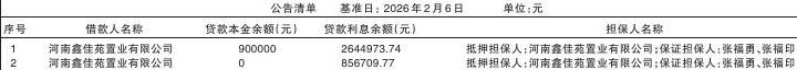 根据中原银行股份有限公司周口分行(下称“中原银行”)与李双德达成的《债权资产转让协议》,中原银行将其对下列公告清单所列借款人享有的主债权及担保合同、抵债协议、还款协议和其他相关协议项下的全部权利依法打包转让给了李双德。中原银行特公告通知借款人及担保人或相关义务人。 李双德作为下列债权的受让方,现公告要求公告清单中所列借款人及其担保人(含相关承债主体、清算主体),从公告之日起立即向李双德履行还本付息义务或相应的担保责任。 特此公告 中原银行股份有限公司周口分行 李双德 2026年4月2日 注:1.本公告清单仅列示截至2026年2月6日的贷款本金余额以及欠息余额。借款人和担保人(含相关承债主体、清算主体)应支付给中原银行的利息、罚息、违约金及其他应付款按借款合同、担保合同、抵债协议、还款协议和其他相关协议及中国人民银行的有关规定或生效法律文书确定的方法计算;已经进入诉讼程序的,并已由中原银行垫付的应由借款人或担保人、承债主体、清算主体负担的诉讼费、律师费等以有关法律文书确定的金额为准。 2.若借款人、担保人因各种原因更名、改制、歇业、吊销营业执照或丧失民事主体资格的,请相关承债主体或主管部门代为履行义务或履行清算责任。 3.下列主债务人、担保人如有疑问,请与中原银行或李双德联系。 4.本公告如有漏登、错登,以实际债权凭证为准。 中原银行联系方式: 地址:周口市川汇区庆丰东路昌建MOCO新世界A栋 联系人:辛先生 电话:13903942779 李双德联系方式: 地址:河南省郑州市中原区建设西路100号 联系人:李双德 电话:18037193999 |