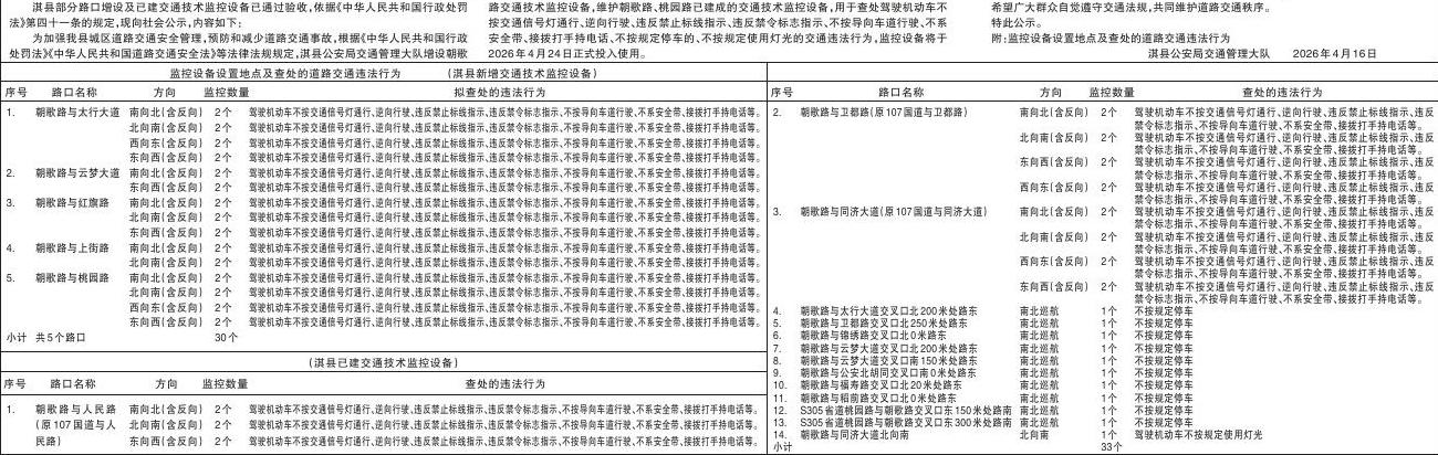 关于淇县部分路口增设及已建交通技术监控设备的公示
