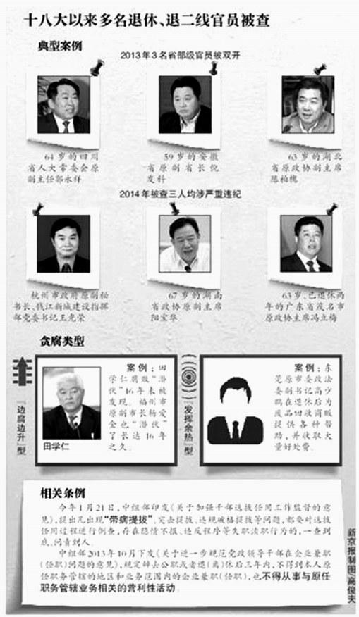 近期,广东省茂名市原政协主席冯立梅等多名涉嫌严重违纪或违法的退休官员相继被查,成为备受社会关注的反腐新动向。“有权不用,过期作废”,以往受官场“潜规则”的影响,不少官员在即将退休或退休后都要抓紧时间“最后捞一把”,并且认为可以“一退了之”不会出事。 十八大以来,从中央到地方连续查处贪腐的退休官员,折射出反腐斗争前所未有的决心和力度。 59岁现象:最后捞一把 5月29日,杭州市纪委宣布,已退休的杭州市政府原副秘书长、钱江新城建设指挥部党委书记王光荣因涉嫌严重违纪,正在接受组织调查;5月26日,中央纪委监察部网站消息称,67岁的湖南省政协原副主席阳宝华涉嫌严重违纪违法,目前正接受组织调查;3月28日,广东省纪委有关负责人证实,63岁、已退休两年的广东省茂名市原政协主席冯立梅涉嫌严重违纪问题,正在接受组织调查…… “有权不用,过期作废。59岁被一些官员视为退休或退居二线的分水岭,在退休前抱着‘最后捞一把’的心理,大肆贪污受贿,以为只要一退休就基本不会出事,这一现象在政治领域被称为‘59岁现象’。”中国纪检监察学院副院长李永忠介绍说。 反腐专家、中央党校教授林喆认为,一件件退休官员被查的案例表明,过了退休这道线并不意味着“平安着陆”。随着反腐走向深水区,退休也不等于进入“保险箱”,不能享有法外豁免的特权。 两官员16年“边腐边升” 记者采访发现,退休官员被查分为两种情况:一是在职时以权谋私,边腐边升直至退休;二是退休后“发挥余热”,继续利用在任时的人脉关系谋取利益。 公开资料显示,1947年10月出生的田学仁2008年从吉林省常务副省长的职位上退下,任吉林银行党委书记、董事长。2012年7月,因查出涉嫌利用职务便利为他人谋取利益,收受巨额钱财,田学仁被开除党籍、开除公职。2013年11月,田学仁被法院以受贿罪判处无期徒刑,并没收个人全部财产。 从1995年至2011年,田学仁“边腐边升”至副部级,腐败“潜伏”16年竟未被发现。无独有偶,2012年落马的退休官员福州市原副市长杨爱金也“潜伏”了长达16年之久。 对此,北京航空航天大学廉洁教育与研究中心教授任建明认为,这表明过去反腐力度不够,有各种各样的因素导致反腐机构不能有效运作。在林喆看来,现阶段应当尽快落实领导干部个人重大事项报告及抽查制度、干部选拔倒查机制。 人脉成为退休牟利资本 从各地查处的反腐案件中可以看出,一些腐败官员在退休后,仍然不忘捞钱,利用在任时积累的人脉关系为请托人谋取不正当利益。 2013年10月,检方指控,涉嫌受贿421万元、犯受贿罪的广东东莞原市委政法委副书记高少鹏在退休后继续利用自己在当地政法界的影响力,为废品回收商贩提供各种帮助,并收取大量好处费。 退休官员利用自己任职时积攒的影响力,在退休后“发挥余热”的事情屡见不鲜。更有不少官员在退休后到企业任职。在职时积累下来的人脉已成为官员退休后牟利的重要资本。 专家分析认为,实际上企业愿意花高价聘请退休官员,要么是希望借助他们的影响力为企业“排忧解难”,要么就是为了感激其在职时的关照而进行的利益输送。 林喆认为,防止领导干部退休后继续腐败需要建立制度。除了明列退休后的禁入领域外,还应当建立离退休领导干部汇报检查制度、离职去向追踪报告制度,并且对其退休后的行为进行监督检查,让规定行之有效、落到实处。 (据新华社)