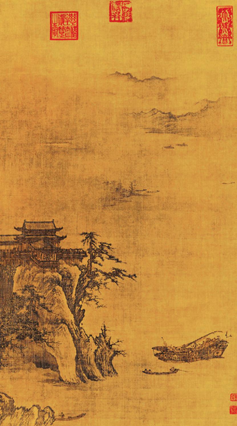 此图无款印,写江天坡石,远山楼阁,舟船人物,松枝虬劲。精致生动。可看出典型的“马夏”式构图,取一角之景,加以远山的绵延起伏,浩渺深远,意境深幽,为画面的水天一色注入了新的活力。画上钤有“苍岩”、“万几清暇”、“大雅斋”、“慈禧太后御览之宝”等收藏印章。