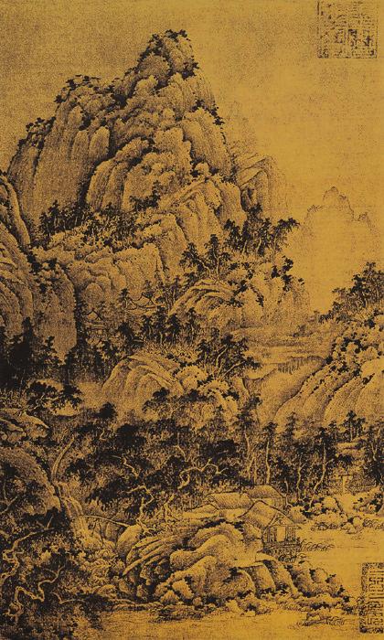 作者:巨然时期:北宋材料:绢本墨笔规格:67.5cmx40.5cm现状:日本阪斋藤氏董藏 此图无款,亦未见历代著录,右上钤有“天历之宝”大印,右下有明纪察司半印,可知曾为元、明内府收藏。 原迹应该尚存人间,可惜藏家秘之不出。前阵子在图书馆借得内藤虎次郎所著《支那绘画史》一本,内有珂罗版印刷的山居图一幅,虽不甚大,赖得制版精良,扫描之后仍能窥得全貌。图上有元文宗「天历之宝」以及明「司印」。 此画群山丛林溪流桥杓竹篱茅舍的山居景色,笔墨松秀粗放,庄重朴实,皴笔长而茁壮,其气格清润而骨体雄伟。 巨然,五代、宋初画家。江宁(今江苏南京)人,开元寺僧。工画山水,师法董源水墨一派而有所发展,所作“淡墨轻岚”,擅长表现江南烟岚气象和山川高旷之景。 |